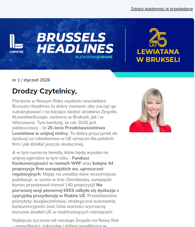 Brussels Headlines to europejski newsletter, który tworzy przedstawicielstwo Konfederacji Lewiatan w Brukseli. Zapisz się i bądź na bieżąco z istotnymi wydarzeniami w Unii Europejskiej z perspektywy biznesu!